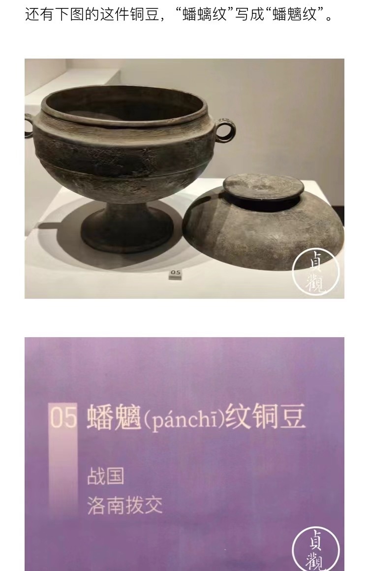 文章稱,秦漢館中很多展品不僅沒有英文標(biāo)識(shí),甚至連展品的基本信息都不全,有的文物名稱也被標(biāo)錯(cuò),如:“鷹獸相搏紋飾銅牌飾” 被誤寫為“銅鷹獸權(quán)博牌飾”;介紹一件銅豆的展品信息中,“蟠螭紋”誤寫成“蟠魑紋”。