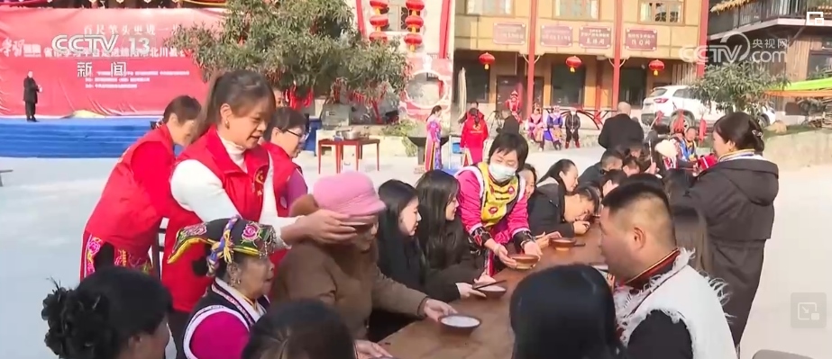 在四川綿陽市北川縣石椅村,一大早,村民和志愿者就忙著熬制臘八粥。石椅村熬制的臘八粥是咸味的,食材除了糯米、花生、白蘿卜、胡蘿卜,還有當(dāng)?shù)氐奶禺a(chǎn)臘肉和豆干。經(jīng)過一個多小時的熬制,別具風(fēng)味的臘八粥就起鍋了。村民們擺上長桌宴,把熱騰騰、香噴噴的臘八粥端到游客面前,一起感受年味兒。