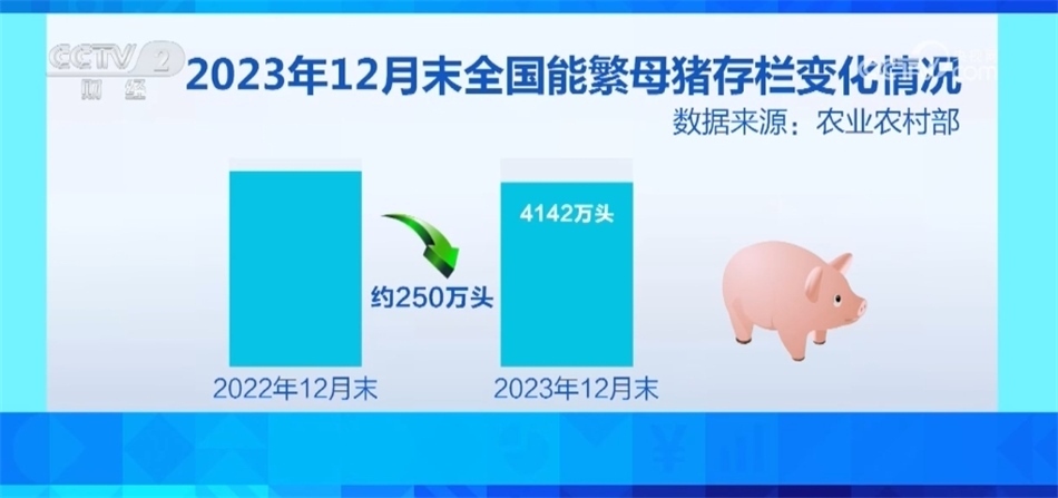 針對(duì)生豬產(chǎn)能偏高、養(yǎng)殖持續(xù)虧損的問(wèn)題,農(nóng)業(yè)農(nóng)村部指導(dǎo)各地加強(qiáng)生豬產(chǎn)能調(diào)控,引導(dǎo)養(yǎng)殖場(chǎng)戶適應(yīng)性調(diào)減產(chǎn)能,順時(shí)順勢(shì)出欄肥豬,加快供需回歸均衡。2023年12月末,全國(guó)能繁母豬存欄量4142萬(wàn)頭,比2022年12月末的階段性高點(diǎn)減少約250萬(wàn)頭。