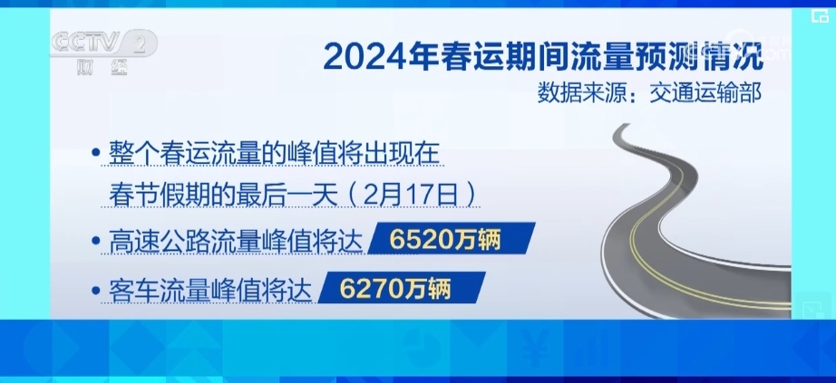 交通運輸部預計,2024年春運期間,全國公路網(wǎng)日均流量將達3720萬輛,比2023年同期增長7.5%。整個春運流量的峰值將出現(xiàn)在春節(jié)假期的最后一天,也就是2月17日,高速公路流量峰值將達6520萬輛,客車流量峰值將達6270萬輛。