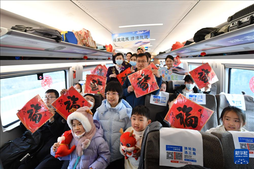 1月26日,在由南京南站發(fā)往太倉的G8981次列車上,南京客運段的工作人員與收到“福”字的旅客合影。新華社記者 柳文惠 攝