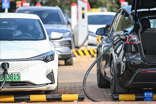 1月20日,新能源電動汽車在位于海南省??谑械囊俪浜?谖捏w公園全液冷超充站充電。新華社記者 蒲曉旭 攝