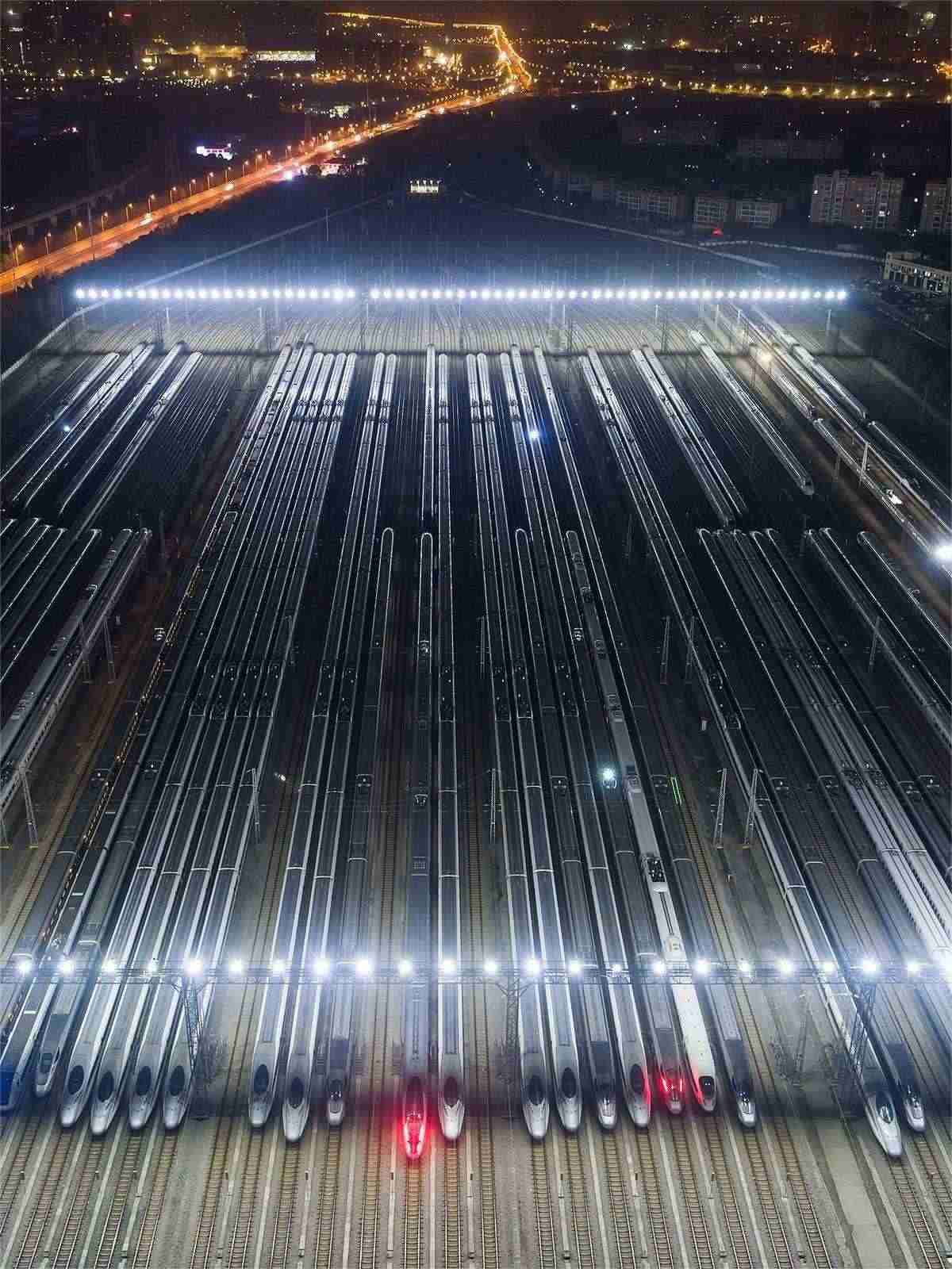 1月26日凌晨1時許,春運前夜,在武漢動車段的存車線上,一列列完成檢修的動車組集結(jié)完畢,猶如“陸地航母”一般,蓄勢待發(fā),迎接春運。(湖北日報全媒記者 任勇 通訊員 許輝 劉博洋 攝)