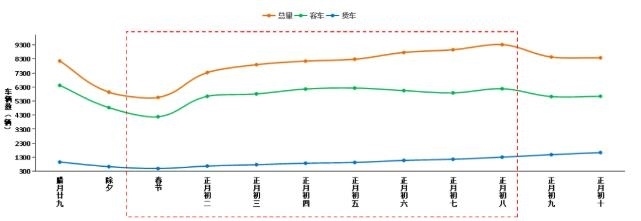 預(yù)計春節(jié)期間全國高速公路客車日均流量約4890萬輛,小客車占客車比例預(yù)計達(dá)99%以上。貨車流量在春節(jié)節(jié)前逐日下降,在正月初一達(dá)到最低值,春節(jié)假期之后逐漸恢復(fù)到日常水平,但貨車流量同比去年預(yù)計有所增長。