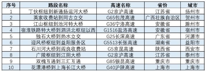 春節(jié)期間,全國高速公路預(yù)計易發(fā)生擁堵緩行的路段,如下表所示。