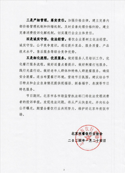 倡議提到,嚴格落實《價格法》《明碼標價和禁止價格欺詐規(guī)定》《規(guī)范促銷行為暫行規(guī)定》等法律法規(guī),不得在標價之外加價出售商品,不得收取任何未予標明的費用,嚴禁“時令價”、嚴禁不標價、嚴禁虛構(gòu)原價、虛假折扣、低標高結(jié)、不履行價格承諾等價格欺詐行為。餐飲企業(yè)年夜飯除提供多種形式的套餐,還應(yīng)提供適合特殊需求的點餐菜單,為廣大消費者提供便利,滿足不同消費者的需求。