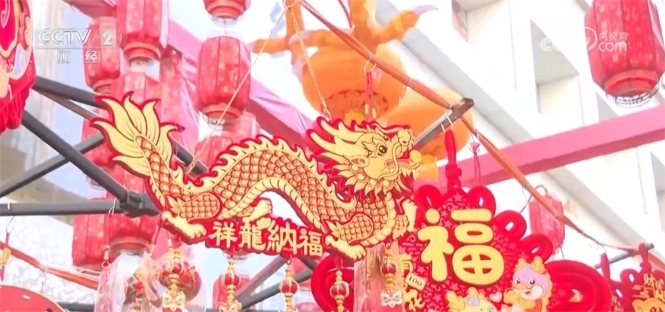 年集現(xiàn)場,不少商家還將帶有龍?jiān)氐男履晷∥锛[放在醒目位置,包括福字貼、紅燈籠、龍玩偶、新年擺件等,無數(shù)個(gè)紅彤彤的小掛件營造出濃厚的新年氛圍,吸引不少市民購買。