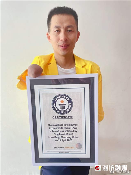 山東濰坊,42歲的丁二偉在8歲時,因為調(diào)皮摸了村里的變壓器造成雙臂截肢。他當(dāng)了11年殘疾人長跑運動員,退役已經(jīng)有10年了。2日,他收到吉尼斯總部寄來的證書,挑戰(zhàn)的項目是一分鐘跪跳起,他一分鐘跳了24個,是跪跳起跳得最多的人。