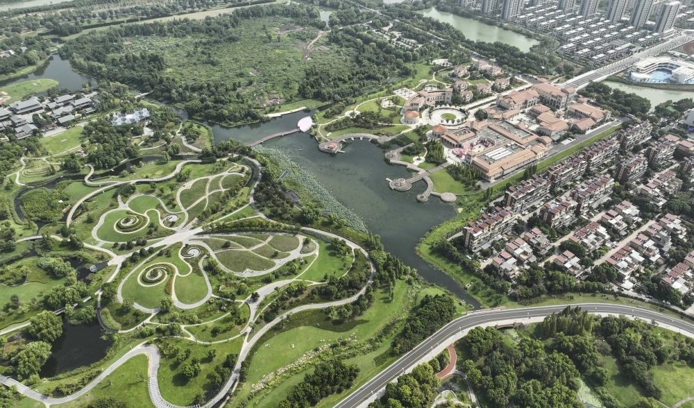 位于浙江省湖州市八里店鎮(zhèn)的西山漾國(guó)家城市濕地公園和周邊的居民區(qū)相互融合(無(wú)人機(jī)照片,2023年8月23日攝)。新華社記者 翁忻旸 攝