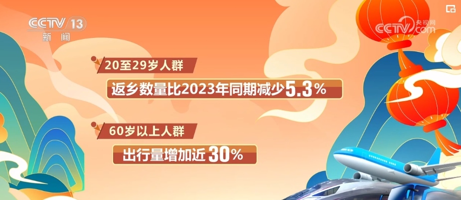 根據(jù)中國聯(lián)通智慧足跡對(duì)出行人群年齡的分析,2024年“反向春運(yùn)”成為新趨勢(shì)。數(shù)據(jù)顯示,20歲—29歲人群的返鄉(xiāng)數(shù)量比2023年同期減少了5.3%,而60歲以上人群的出行量卻增加了近30%。