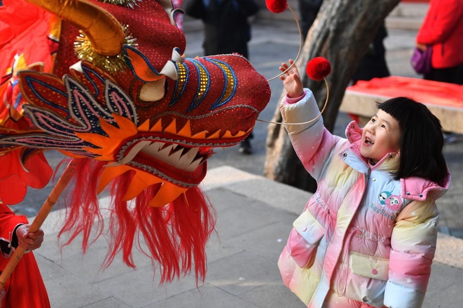 2024年2月10日,在山東省青島市市南區(qū)天后宮舉行的民俗文化廟會上,一名小朋友在觀看舞龍祈福表演。新華社發(fā)(王海濱 攝)