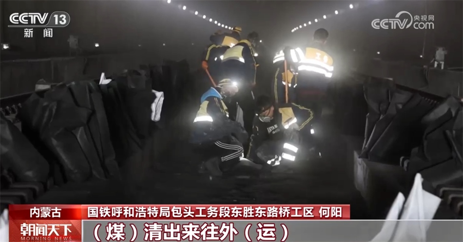 國鐵呼和浩特局包頭工務(wù)段東勝東路橋工區(qū) 何陽:這塊就已經(jīng)(堆)積得相當(dāng)厚了,咱們今天必須抓緊時間把這個清出來,煤清出來往外運(yùn),要不然后面影響貨車正常通行。