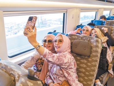 乘客在行駛中的雅萬(wàn)高鐵車廂內(nèi)拍照。作為“一帶一路”倡議和中印尼兩國(guó)務(wù)實(shí)合作的標(biāo)志性項(xiàng)目,雅萬(wàn)高鐵全線采用中國(guó)技術(shù)、中國(guó)標(biāo)準(zhǔn)。新華社記者 徐 欽攝