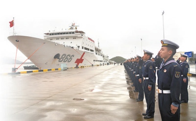 執(zhí)行“和諧使命—2022”任務(wù)的中國(guó)海軍“和平方舟”號(hào)醫(yī)院船返回浙江舟山某軍港,任務(wù)部隊(duì)官兵代表在碼頭迎接?!昂推椒街邸碧?hào)醫(yī)院船是我國(guó)自主設(shè)計(jì)建造的首艘制式遠(yuǎn)洋醫(yī)院船。自2008年入列以來(lái),該船以“和諧使命”任務(wù)為主要載體,多次遠(yuǎn)赴海外開(kāi)展人道主義醫(yī)療服務(wù)。孫 飛攝(新華社發(fā))
