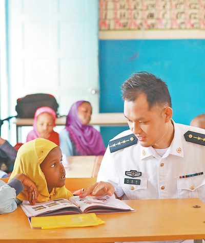 中國(guó)人民解放軍駐吉布提保障基地官兵與吉小學(xué)生交流。中國(guó)軍隊(duì)在吉布提建設(shè)保障基地,是中吉兩國(guó)政府經(jīng)過(guò)友好協(xié)商作出的決定,為中國(guó)軍隊(duì)執(zhí)行護(hù)航、維和任務(wù)等提供有力保障。30多年來(lái),我國(guó)已派出維和人員5萬(wàn)余人次,赴20多個(gè)國(guó)家和地區(qū)參加聯(lián)合國(guó)維和行動(dòng)。王宗洋攝(影像中國(guó))