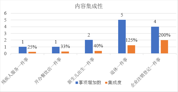 從內(nèi)容集成度看,5項(xiàng)相關(guān)“一件事”的事項(xiàng)集成比例均有不同程度提升。“殘疾人服務(wù)一件事”增加1個(gè)事項(xiàng),集成度提升25%?!伴_(kāi)辦餐飲店一件事”增加1個(gè)事項(xiàng),集成度提升33%。“新生兒出生一件事”增加2個(gè)事項(xiàng),集成度提升40%?!巴诵菀患隆痹黾?個(gè)事項(xiàng),集成度提升125%?!捌髽I(yè)注銷登記一件事”增加4個(gè)事項(xiàng),集成度提升200%。