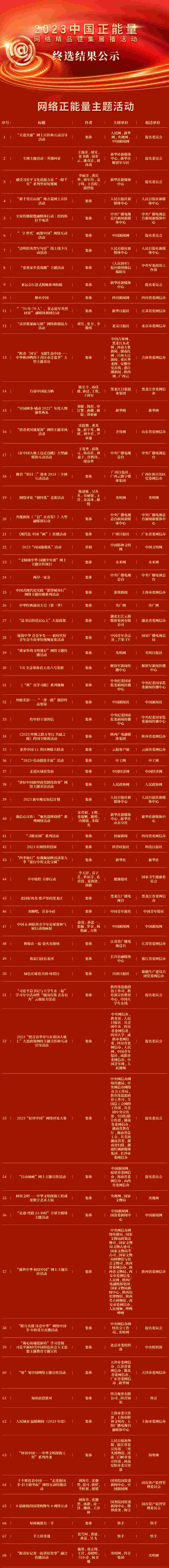 記者從中央網(wǎng)信辦獲悉,2023中國正能量網(wǎng)絡精品終選結(jié)果出爐,550件網(wǎng)絡正能量作品脫穎而出。