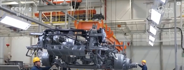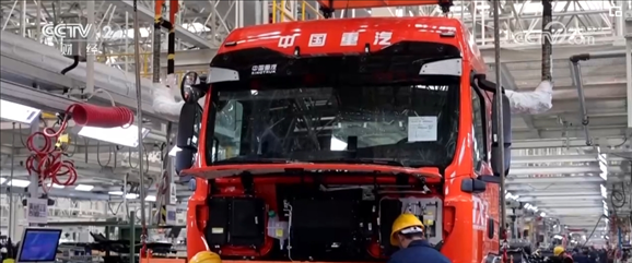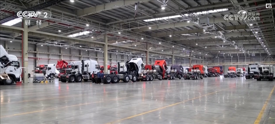 在山東濟南一家重卡生產企業(yè)的總裝車間里,貨運機器人將重卡的車架依次傳送到各工作站,工人熟練地將發(fā)動機、散熱器、輪胎等零件加裝到車架上。工作人員介紹,一輛重卡從接到訂單開始排產到交付客戶僅需五六天。