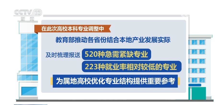據(jù)介紹,在本次高校專業(yè)調整中,教育部推動各省份結合本地產業(yè)發(fā)展實際,及時梳理報送了520種急需緊缺專業(yè)和223種就業(yè)率相對較低的專業(yè),為屬地高校優(yōu)化專業(yè)結構提供重要參考。