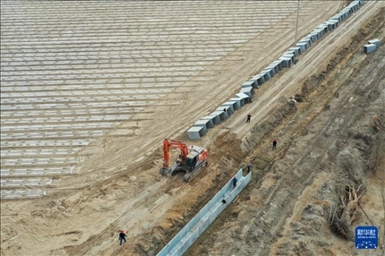 在新疆阿克蘇地區(qū)阿瓦提縣高標(biāo)準(zhǔn)農(nóng)田核心示范區(qū),施工人員在棉田外修建防滲渠(3月27日攝,無人機(jī)照片)。