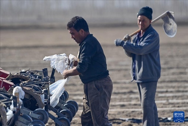 在新疆阿克蘇地區(qū)阿瓦提縣高標(biāo)準(zhǔn)農(nóng)田核心示范區(qū),棉農(nóng)查看棉花種子(3月27日攝)。