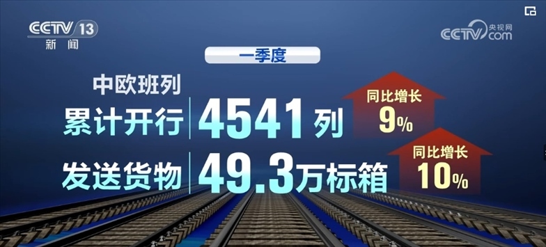 數(shù)據(jù)顯示,一季度中,歐班列累計(jì)開行4541列,發(fā)送貨物49.3萬標(biāo)箱,同比分別增長(zhǎng)9%、10%。