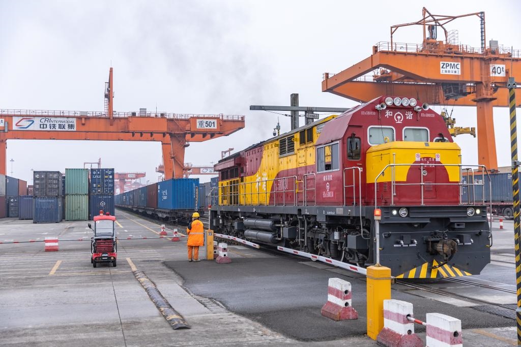 3月7日,一列滿載機械設備、整車及零部件等貨物的中歐班列在重慶團結村中心站等候發(fā)車。新華社記者 黃偉 攝