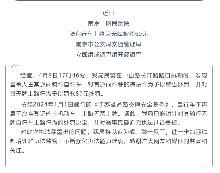 ·南京交警回應(yīng)市民騎自行車無(wú)牌被罰50元:撤銷處罰,追究民警責(zé)任。