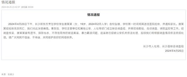 ·湖南長沙縣通報“女生跳樓身亡”:不存在網傳被造黃謠、暴力霸凌問題,造謠者已被依法處理。