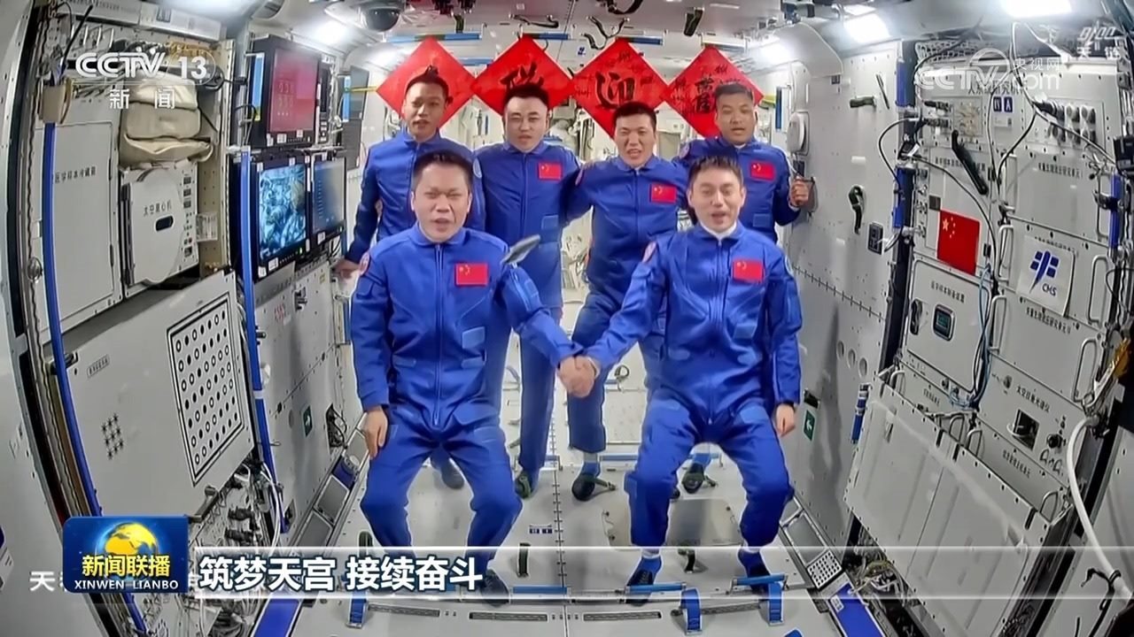 隨后,兩個(gè)航天員乘組拍下“全家?!?,共同向牽掛他們的全國(guó)人民報(bào)平安。