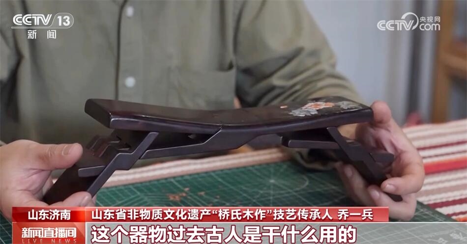 山東省非物質文化遺產(chǎn)“橋氏木作”技藝傳承人喬一兵介紹:“它本身是一整塊木頭六個面,通過鋸和鑿形成一個器物。這個器物過去古人是干什么用的?當枕頭用的,也可以當?shù)首佑茫畲蟮奶攸c是可以折疊,攜帶非常方便,傳說是魯班發(fā)明的。和眾多的優(yōu)秀的傳統(tǒng)技藝一樣,它深層次代表的是中國的一些思想、一些哲學、一些文化在里邊,魯班枕的核心是平衡和和諧,我覺得我很有必要把它傳承下來,發(fā)揚光大。”