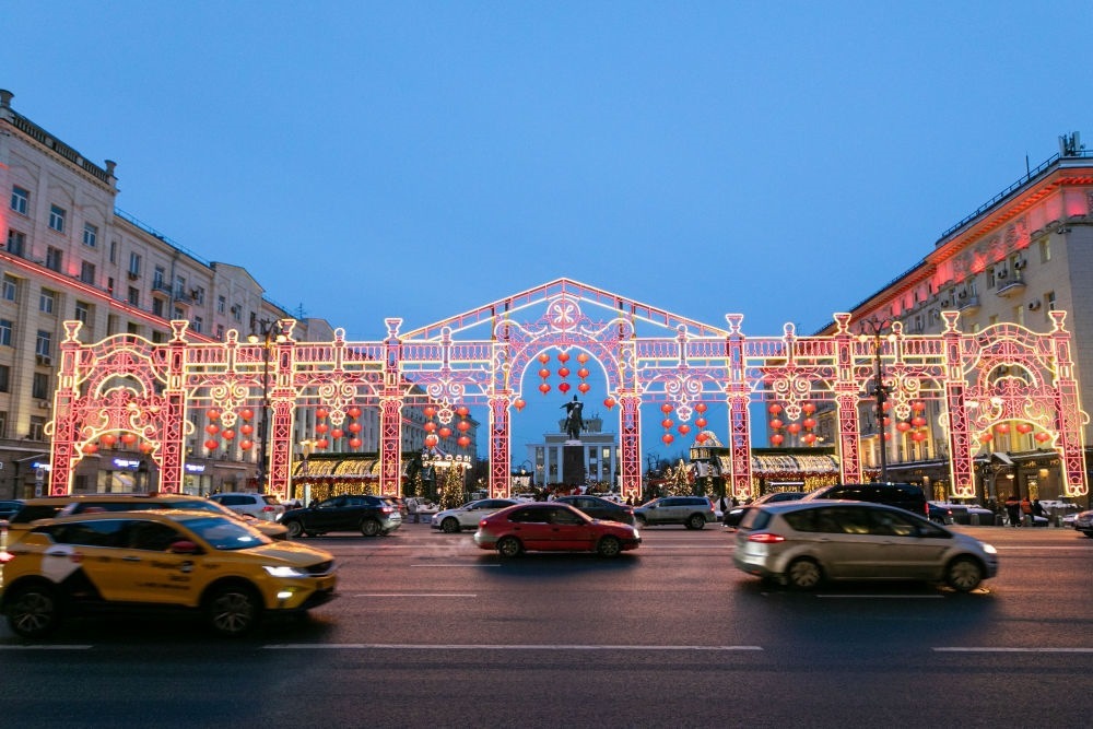 2024年2月9日,在俄羅斯首都莫斯科,車輛在中國新年主題裝飾前駛過。當日,“莫斯科的中國新年”文化活動在俄羅斯首都莫斯科市中心啟動。新華社記者 白雪騏 攝