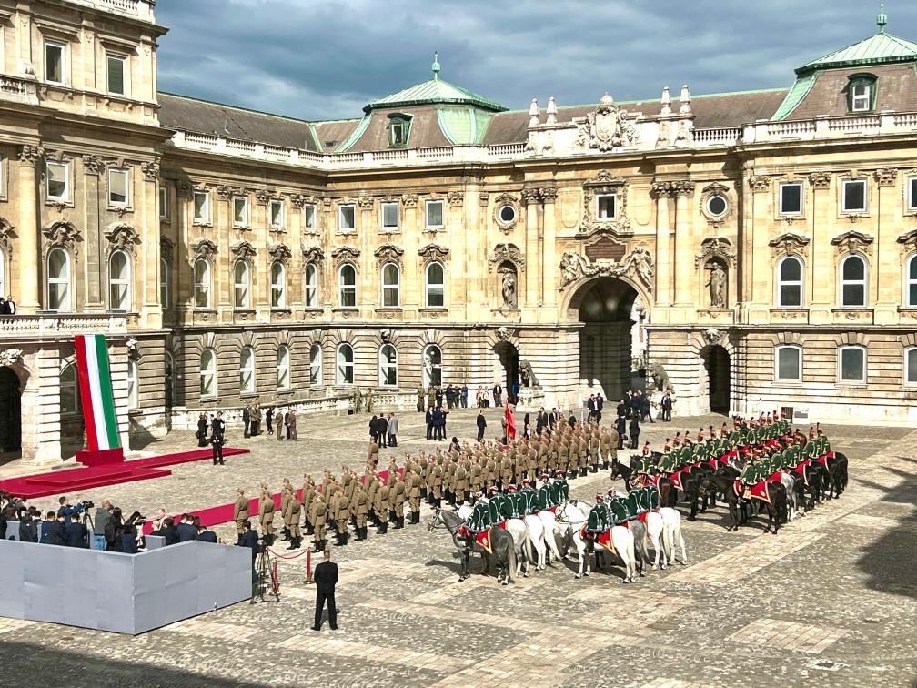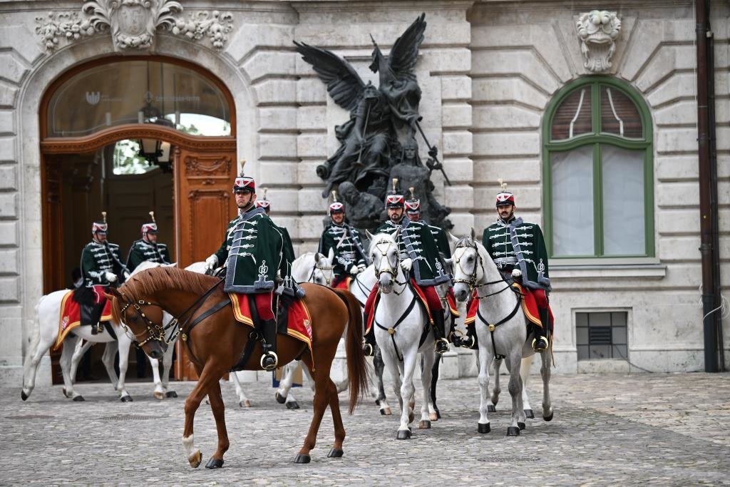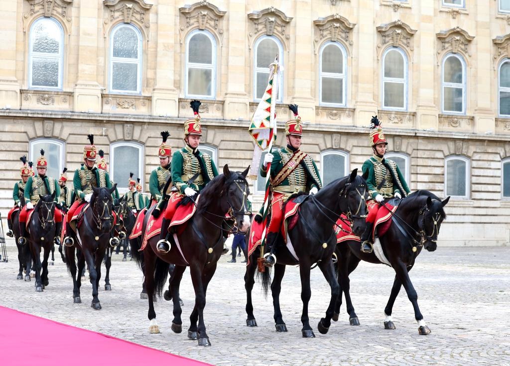 初夏時節(jié)的布達佩斯陽光明媚,古老宏偉的布達王宮莊嚴(yán)矗立,中匈兩國國旗相映成輝。習(xí)近平和夫人彭麗媛乘坐的國賓車隊在匈牙利禮賓馬隊護衛(wèi)下緩緩駛?cè)氩歼_王宮內(nèi)庭。舒尤克總統(tǒng)夫婦和歐爾班總理夫婦熱情迎接。