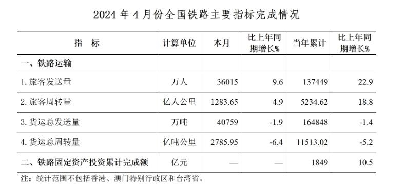 央視網(wǎng)消息:據(jù)國(guó)家鐵路局消息,4月,全國(guó)鐵路旅客發(fā)送量36015萬(wàn)人,同比增長(zhǎng)9.6%。鐵路固定資產(chǎn)投資累計(jì)完成1849億元,同比增長(zhǎng)10.5%。