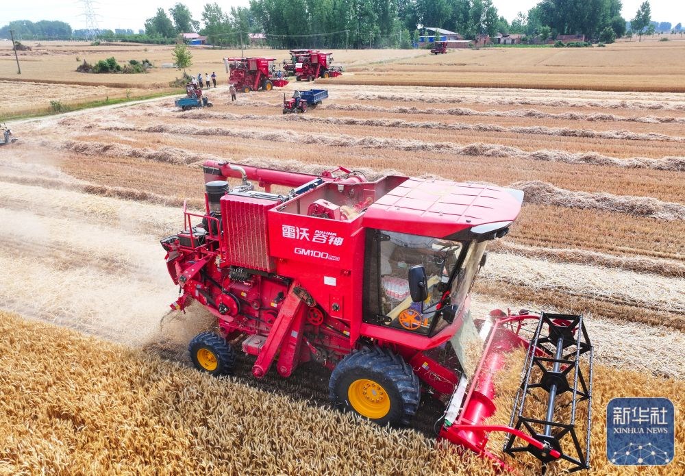 5月24日,河南省駐馬店市正陽(yáng)縣王勿橋鄉(xiāng)謝莊村村民在搶收小麥(無(wú)人機(jī)照片)。新華社發(fā)(高萬(wàn)寶攝)