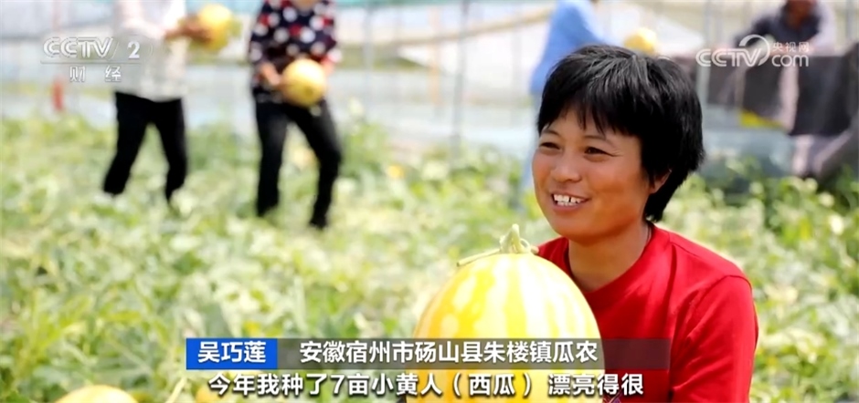 安徽碭山縣朱樓鎮(zhèn)瓜農(nóng)吳巧蓮介紹:“今年我種了7畝小黃人西瓜,漂亮得很,產(chǎn)量在8000斤左右,價格每斤3元左右,比普通的瓜一斤貴一元多。這個瓜賣30多元一個。”