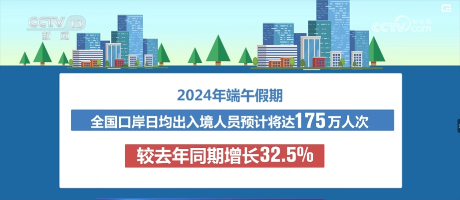 央視網(wǎng)消息:記者6月6日從國家移民管理局獲悉,2024年端午假期,全國口岸日均出入境人員預(yù)計(jì)將達(dá)175萬人次,較2023年同期增長(zhǎng)32.5%。