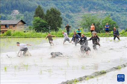 重慶市酉陽土家族苗族自治縣花田鄉(xiāng)何家?guī)r村的村民參加慶端午民俗活動。