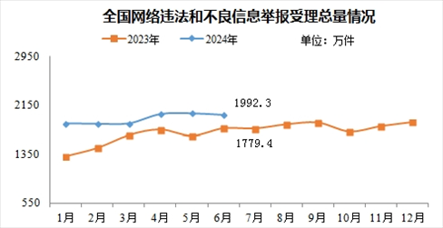 來自中央網(wǎng)信辦舉報中心的消息,2024年6月,中央網(wǎng)信辦舉報中心指導全國各級網(wǎng)信舉報工作部門、主要網(wǎng)站平臺受理網(wǎng)民舉報色情、賭博、侵權、謠言等違法和不良信息1992.3萬件,環(huán)比下降1.3%、同比增長12%。