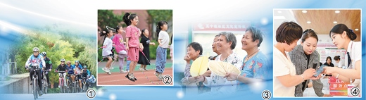 圖①:河北邯鄲市復(fù)興區(qū)沁河源景區(qū),騎行愛好者在騎行。聶長青攝 圖②:河南洛陽市瀍河回族區(qū)君河灣小學,暑期托管班的學生在跳繩。李衛(wèi)超攝 圖③:安徽合肥市蜀山區(qū)小廟鎮(zhèn)五十墩社區(qū)文化廣場,村民在看戲曲演出。陳三虎攝 圖④:內(nèi)蒙古鄂爾多斯市康巴什區(qū)寧馨社區(qū)政務(wù)便民服務(wù)站,工作人員幫居民辦業(yè)務(wù)。王 正攝