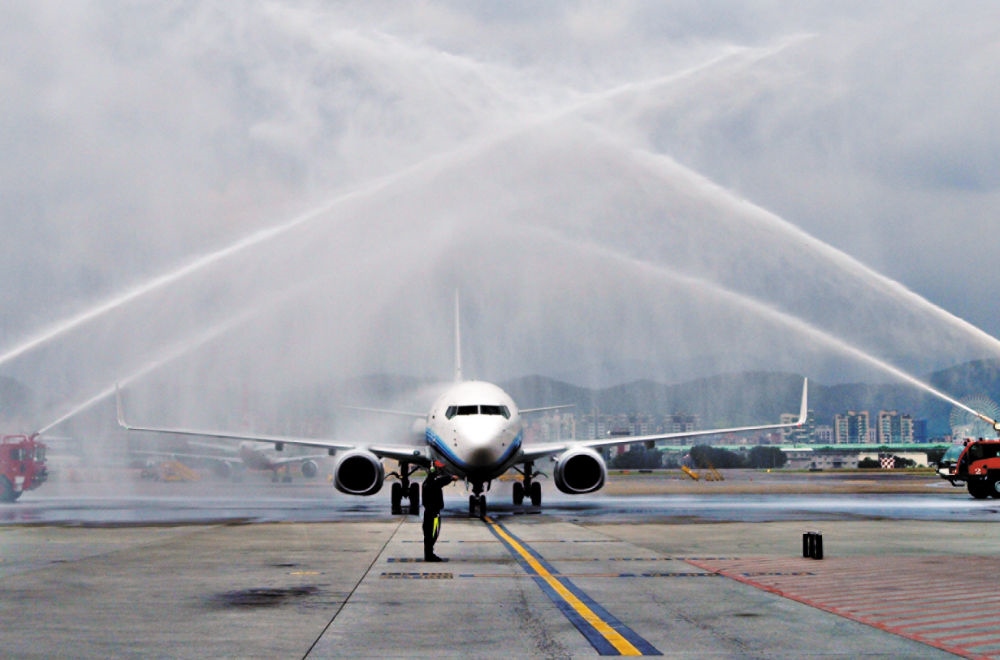 2008年,兩岸“三通”啟動(dòng)常態(tài)包機(jī),廈航成為廈門、福州和杭州航點(diǎn)的運(yùn)營(yíng)航空公司。這是2008年12月15日,臺(tái)北松山機(jī)場(chǎng)以“水門”儀式迎接廈航常態(tài)化包機(jī)。
