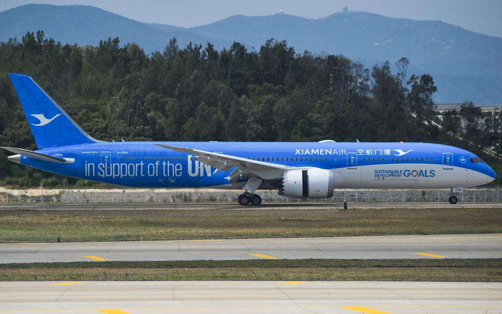 2018年3月21日,聯(lián)合國(guó)特殊涂裝飛機(jī)廈門航空“聯(lián)合夢(mèng)想號(hào)”正式在福建福州長(zhǎng)樂(lè)國(guó)際機(jī)場(chǎng)亮相。新華社記者 宋為偉 攝