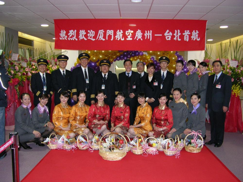 2005年,海峽兩岸首次開(kāi)放春節(jié)包機(jī)。這是2005年1月29日,廈航作為大陸6家參與臺(tái)商春節(jié)包機(jī)直航的航空公司之一,圓滿完成了廣州-臺(tái)北往返包機(jī)任務(wù)。這是廈航首航臺(tái)北機(jī)組成員在臺(tái)北與迎接人員親切合影。