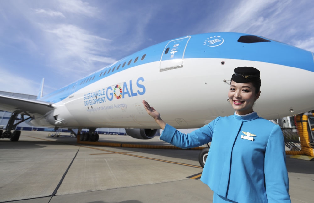 2018年1月26日,在美國(guó)查爾斯頓波音工廠,中國(guó)廈門航空公司的一名空乘人員展示廈航首架涂裝宣傳聯(lián)合國(guó)可持續(xù)發(fā)展目標(biāo)的客機(jī)。新華社記者 王迎 攝