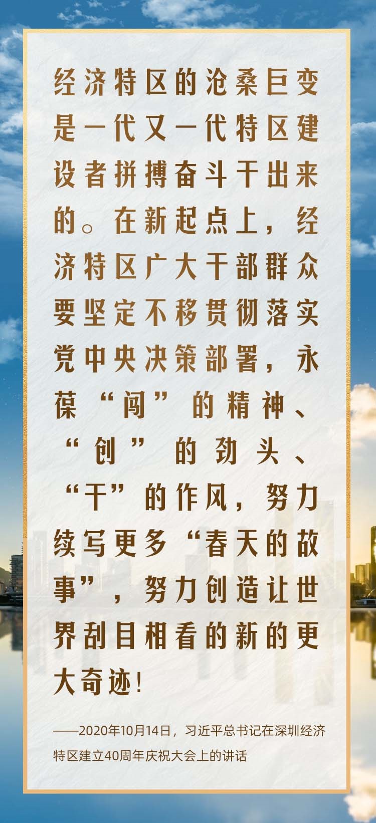2020年10月,在慶祝深圳經(jīng)濟(jì)特區(qū)建立40周年之際,習(xí)近平總書記又一次來到這里,出席慶祝大會,強(qiáng)調(diào)改革不停頓、開放不止步,在更高起點(diǎn)上推進(jìn)改革開放,推動經(jīng)濟(jì)特區(qū)工作開創(chuàng)新局面。
