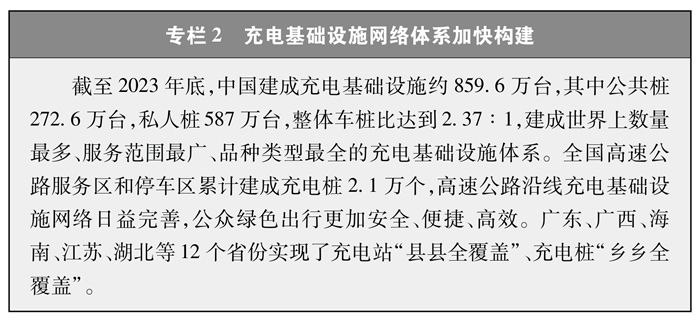 全方位構(gòu)建清潔高效的交通運(yùn)輸體系。隨著經(jīng)濟(jì)社會(huì)發(fā)展,物流、出行需求不斷增加,交通用能還將持續(xù)增長(zhǎng)。中國(guó)加快發(fā)展多式聯(lián)運(yùn),提高鐵路、水路在綜合運(yùn)輸中的承運(yùn)比重。深入推進(jìn)城市公共交通優(yōu)先發(fā)展,構(gòu)建完善綠色出行服務(wù)體系,在城市客運(yùn)領(lǐng)域推廣應(yīng)用新能源車輛。機(jī)動(dòng)車排放標(biāo)準(zhǔn)與世界先進(jìn)水平接軌,基本淘汰國(guó)三及以下排放標(biāo)準(zhǔn)汽車。運(yùn)輸能耗強(qiáng)度不斷下降,2023年鐵路單位運(yùn)輸工作量綜合能耗較2013年下降約19%。大力發(fā)展充電基礎(chǔ)設(shè)施網(wǎng)絡(luò),完善加氫、加氣站點(diǎn)布局及服務(wù)設(shè)施。截至2023年底,累計(jì)建成充電基礎(chǔ)設(shè)施近860萬(wàn)臺(tái),加氫站超過(guò)450座。