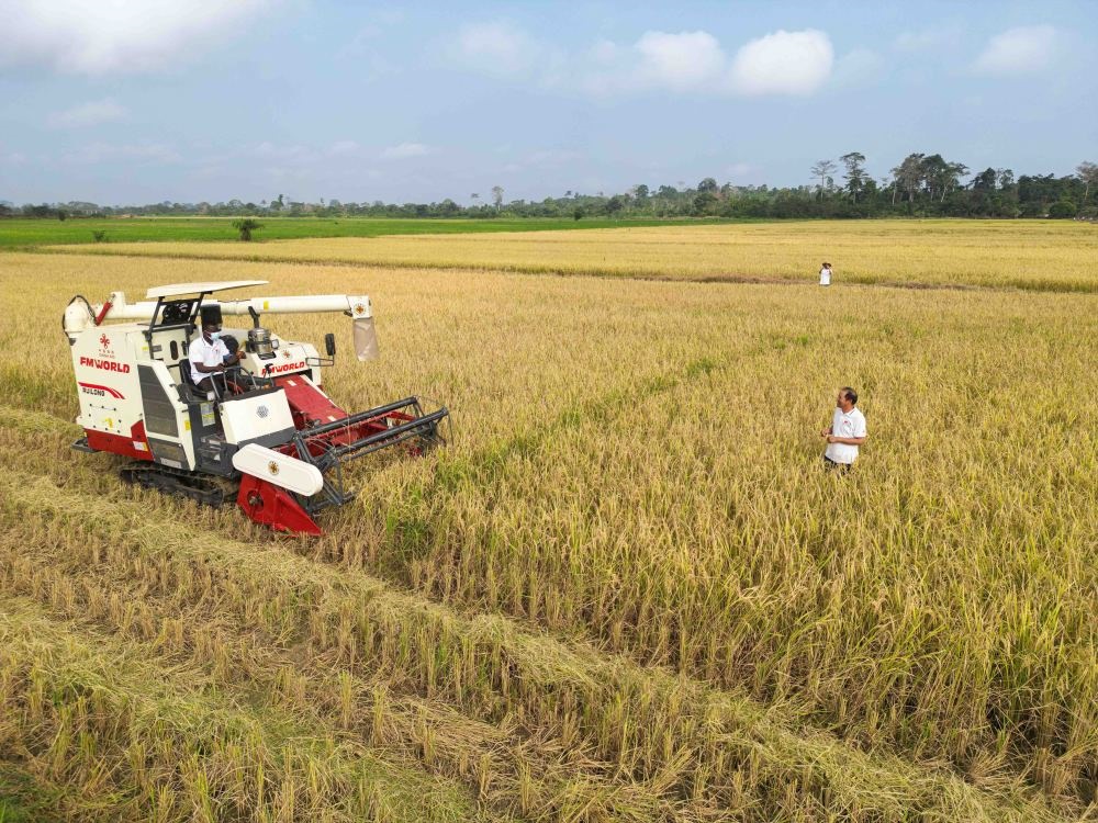 2024年1月8日,在科特迪瓦南部迪沃省格格杜墾區(qū),中國援科農(nóng)業(yè)技術合作組組長郭長友(右一)指導稻農(nóng)駕駛收割機收割水稻(無人機照片)。格格杜墾區(qū)是中科兩國農(nóng)業(yè)合作示范基地,也是科特迪瓦全國聞名的水稻種植基地。