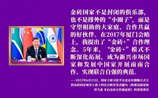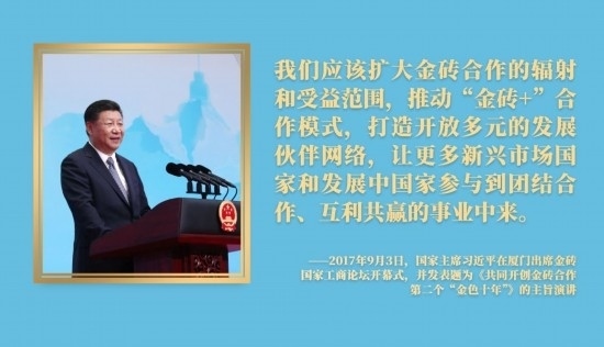 面向未來,金磚國家敞開大門謀發(fā)展、張開懷抱促合作。中國將攜手金磚伙伴,推動“大金磚合作”不斷取得新成果。