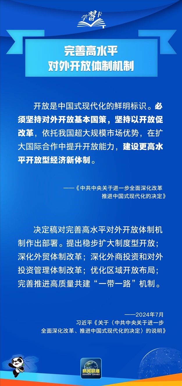 今年7月,黨的二十屆三中全會審議通過《中共中央關(guān)于進一步全面深化改革 推進中國式現(xiàn)代化的決定》。這份綱領(lǐng)性文件明確提出,“完善高水平對外開放體制機制”。