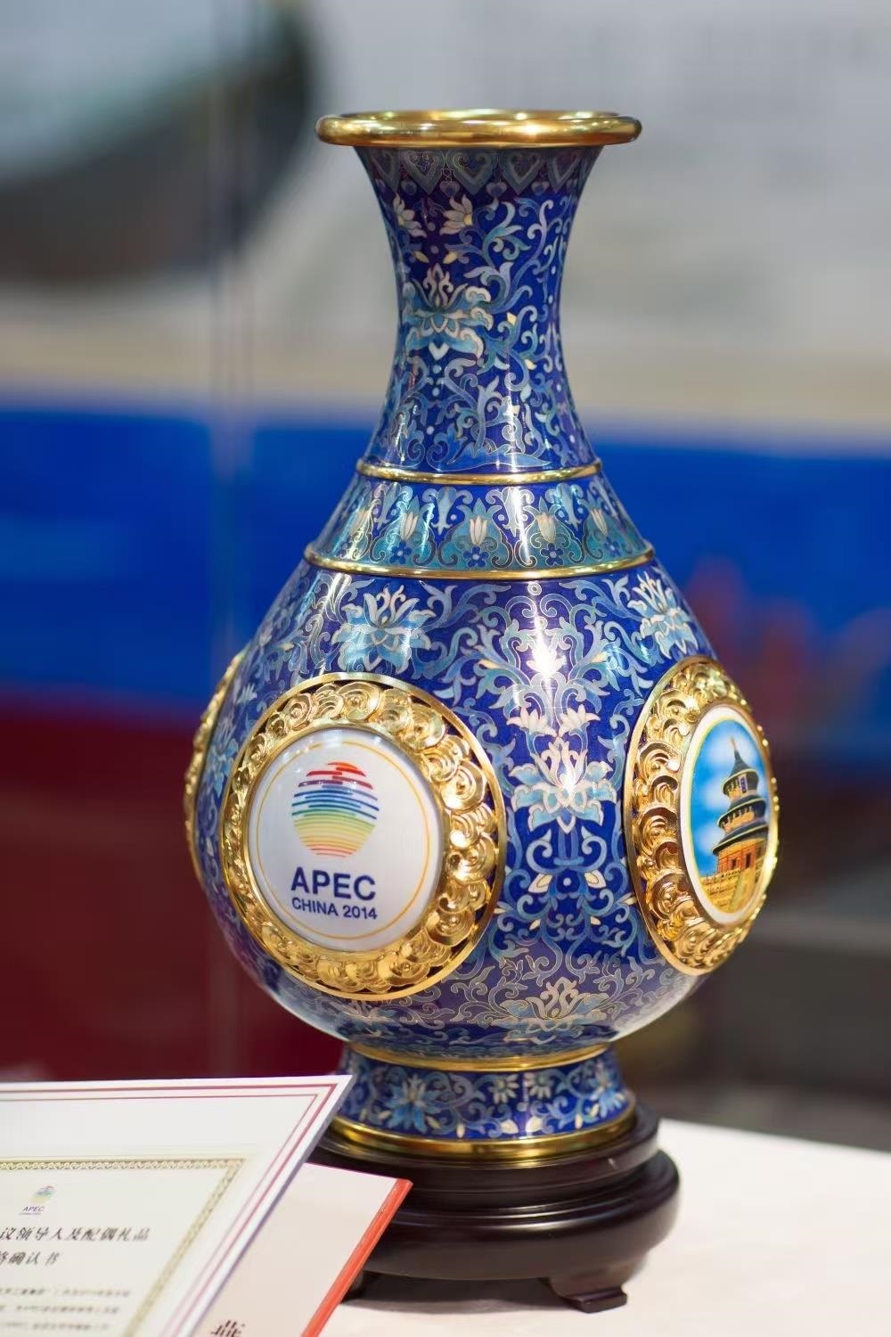 2014年11月,北京APEC會議在雁棲湖畔舉行。為歡迎參會的各經(jīng)濟體領導人,習近平主席選定了一件國禮——“四海升平”景泰藍賞瓶。賞瓶的細節(jié)蘊含巧思:瓶高38厘米,是天壇祈年殿38米的等比例縮??;最大直徑21厘米,代表APEC的21個經(jīng)濟體。碧藍的瓶身雕著水紋,既象征“四?!币泊憝h(huán)太平洋。“瓶”是“平”的諧音,連起來即“四海升平”。